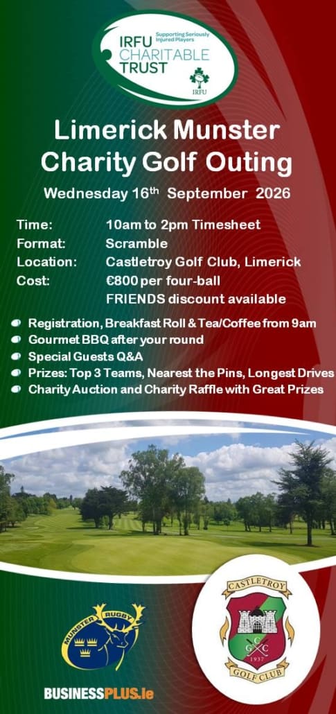 We’re delighted to launch the very first IRFU Charitable Trust Limerick Munster Charity Golf Outing, taking place in the beautiful Castletroy Golf Club on Wednesday, 16th September 2026.